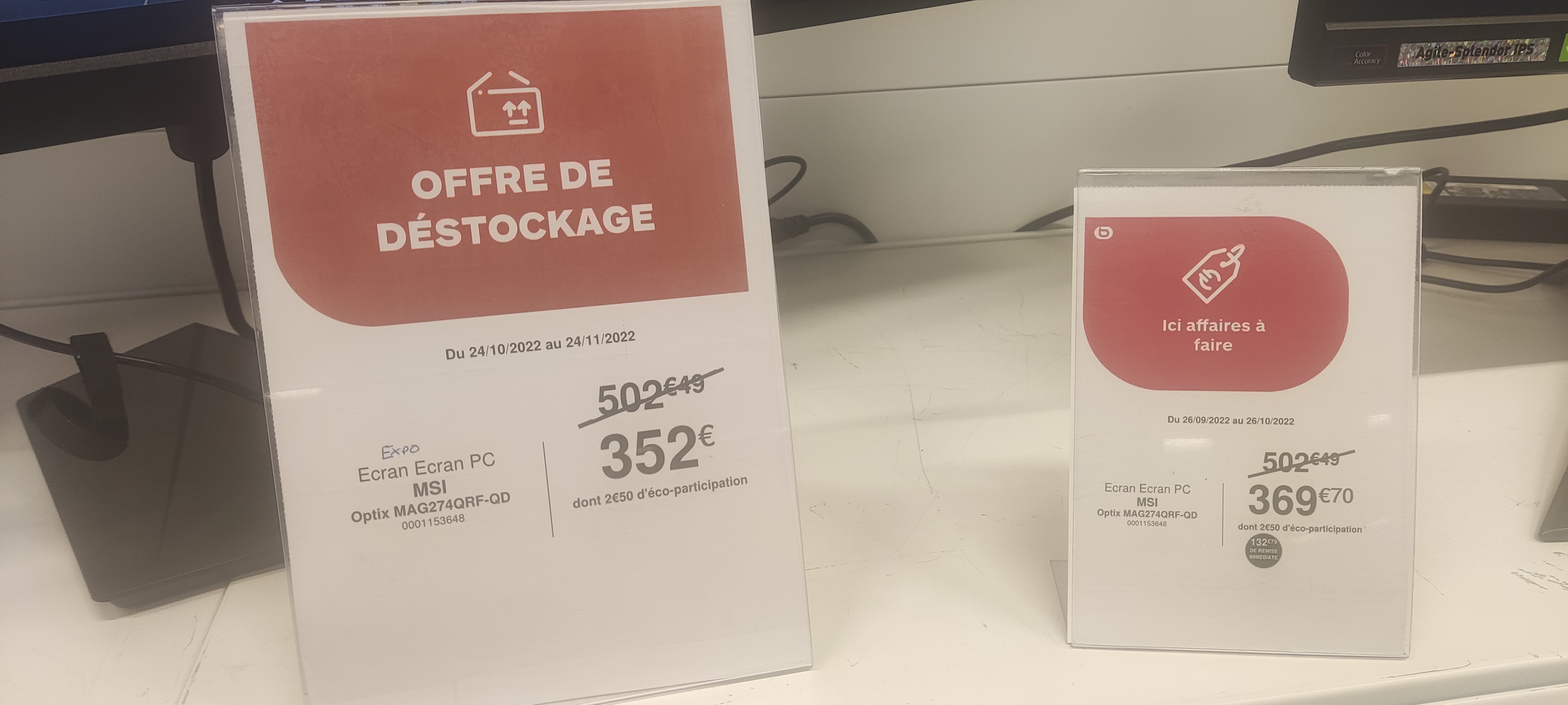 Bonjour James, si vous regardez bien l'offre sur l'étiquette de balisage, vous vous apercevrez que le prix de référence du produit est de 509.99€ , et le prix du black friday est annoncé à 469.99€. Sauf que depuis le produit a encore baissé. L'étiquette électronique qui se met à jour automatiquement reprend donc le nouveau prix de référence , soit 469.99€ qui est le dernier prix auquel ce produit a été vendu, ce prix est barré sur l'étiquette électronique et est donc descendu à 437.99€. Le produit à l'instant T est donc bien vendu à 437.99€. Espérant avoir pu vous éclairer. Il n'y a donc pas d'erreur mais une double baisse du prix du produit en quelques jours. Bien cordialement . W. Andrieux